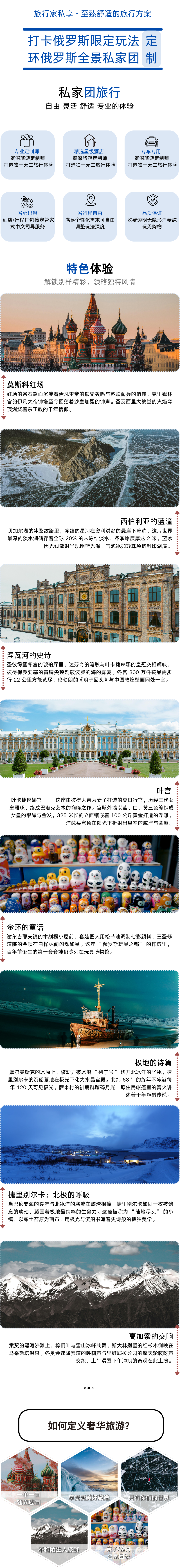 这是一场跨越维度的感官盛宴 —— 在摩尔曼斯克的核动力破冰船上触摸工业文明的冷峻,在贝加尔湖的冰原上聆听冰层开裂的轰鸣;在圣彼得堡的叶卡捷琳娜宫惊叹巴洛克的奢靡,在堪察加的火山口感受地心的呼吸。俄罗斯的每一寸土地都在诉说:真正的永恒,是冰川与火焰的共舞,是历史与自然的深情相拥。